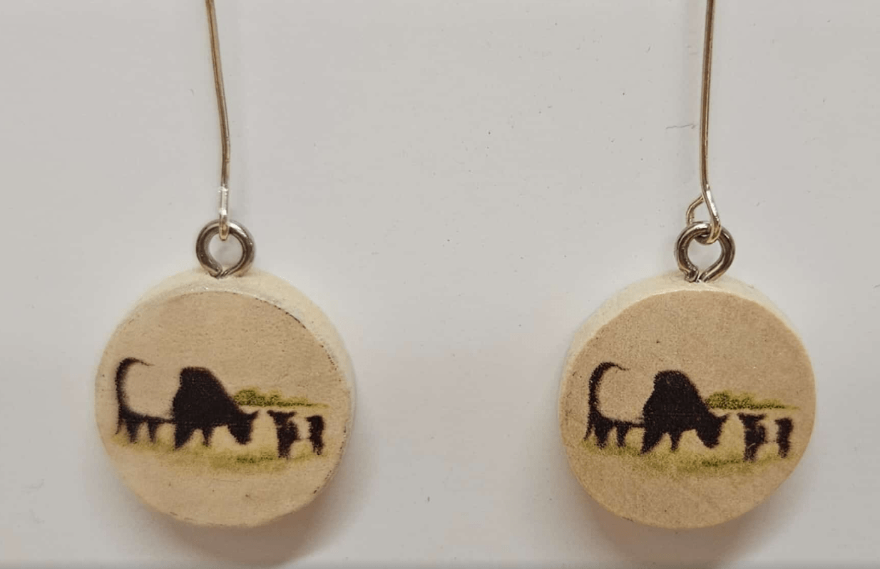 Silver plated drop earrings featuring a Belted Galloway Cow with Calf on a wooden counter.