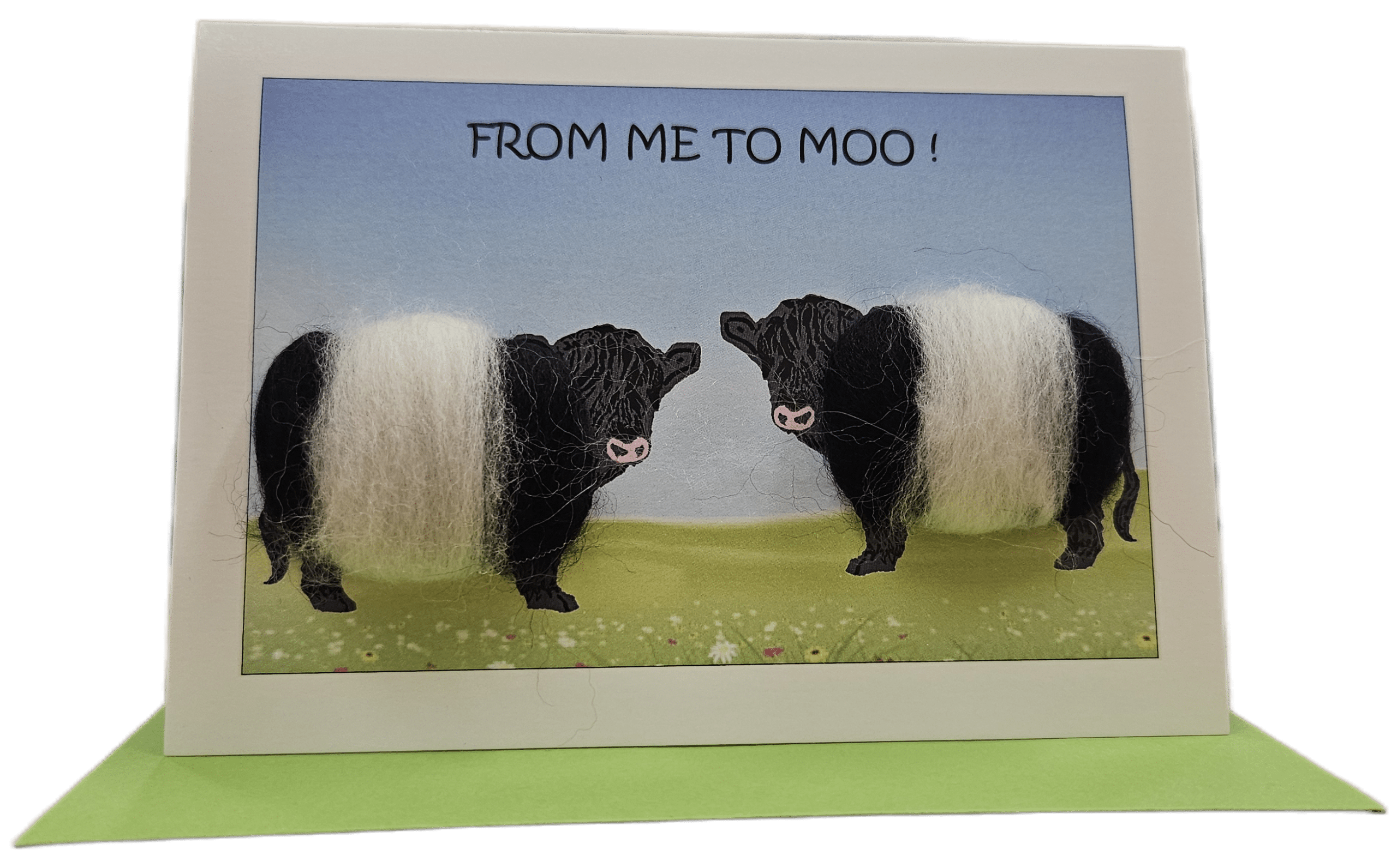 A delightful card featuring two Belted Galloway Cows by We Must be Mugs cards. Blank inside for your own message.