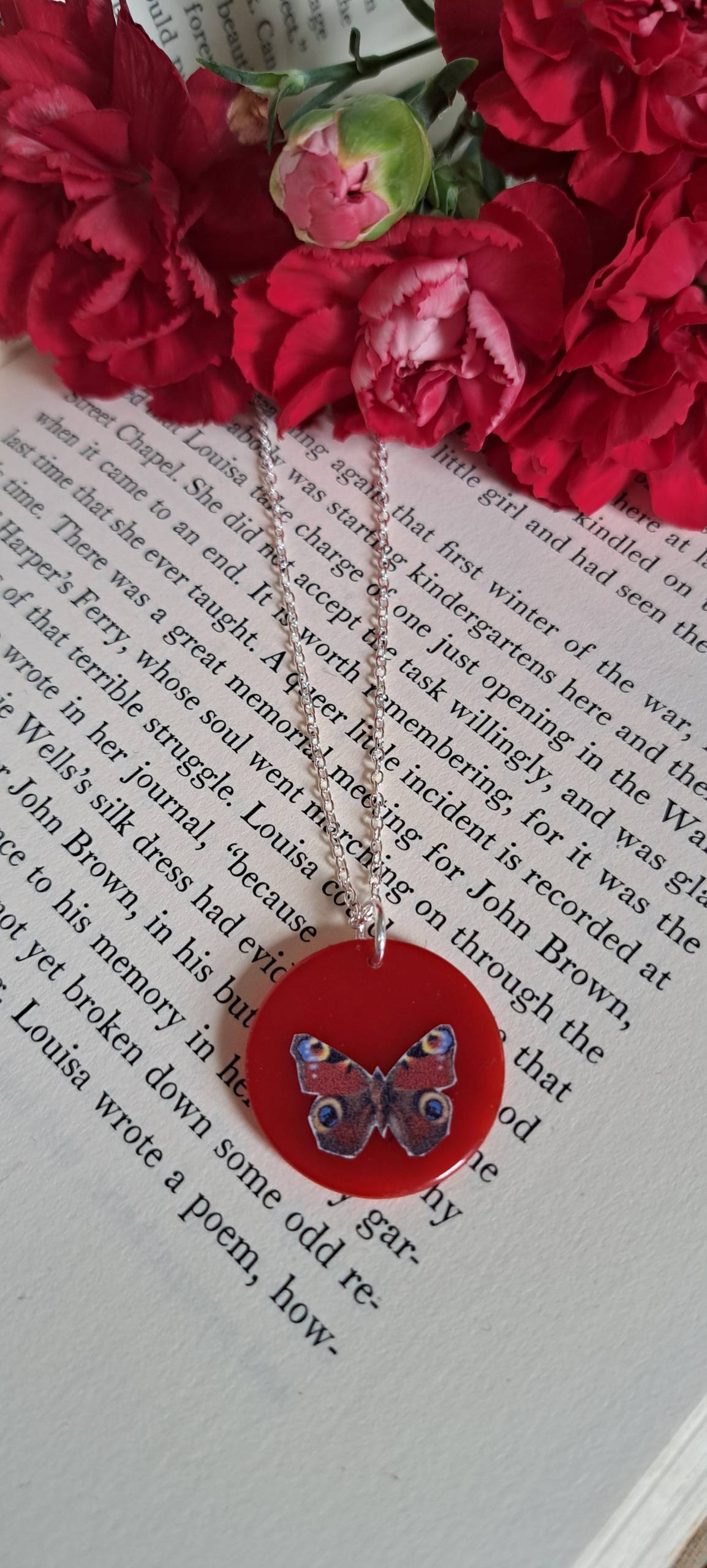 Silver plated necklace featuring a native Peacock Butterfly on a red counter.