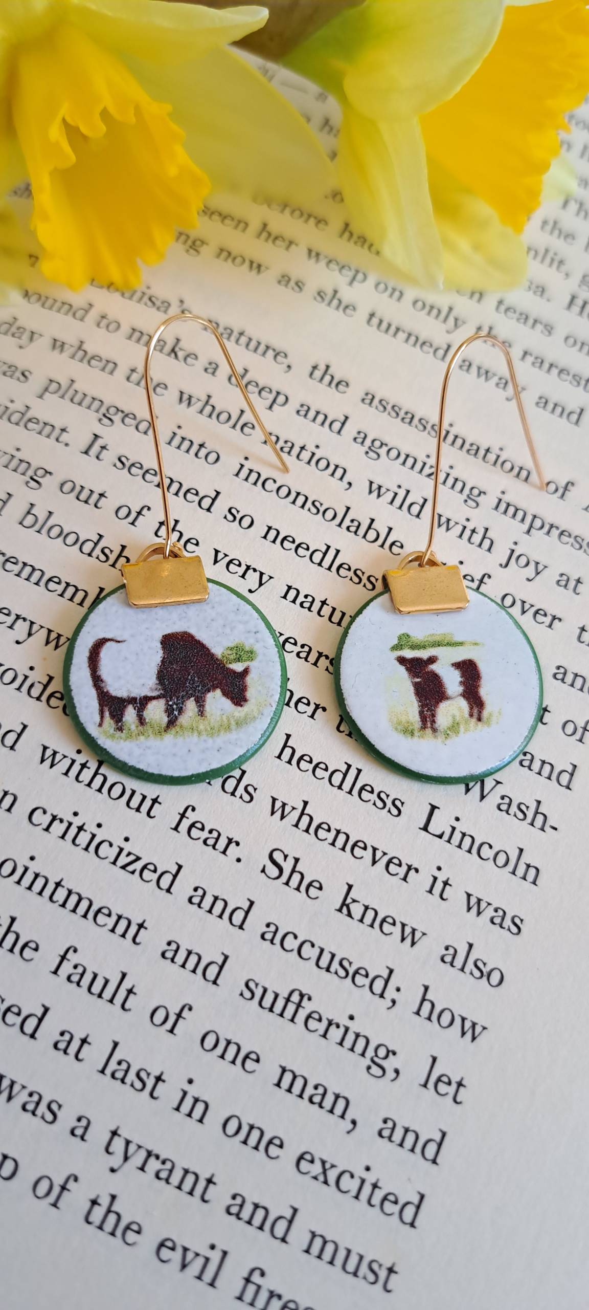 Gold plated drop earrings featuring a Belted Galloway Cow on one and a Calf on the other, both on a green counter.
